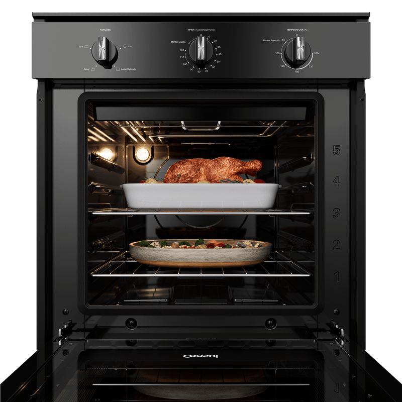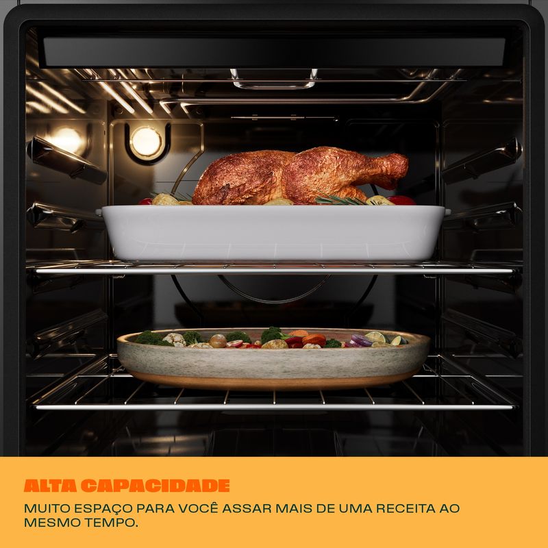 Agora você já pode cozinhar sem se preocupar com espaço no forno. Com as 2 prateleiras, você assa diferentes pratos de uma vez, e ajustando os 5 níveis de altura, prepara desde pequenos até grandes assados.