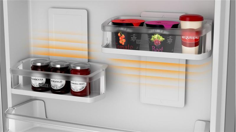 Lugar de alimento é na prateleira que você quiser! Tecnologia que distribui o ar frio igualmente na geladeira, dá para organizar tudo do seu próprio jeito.
