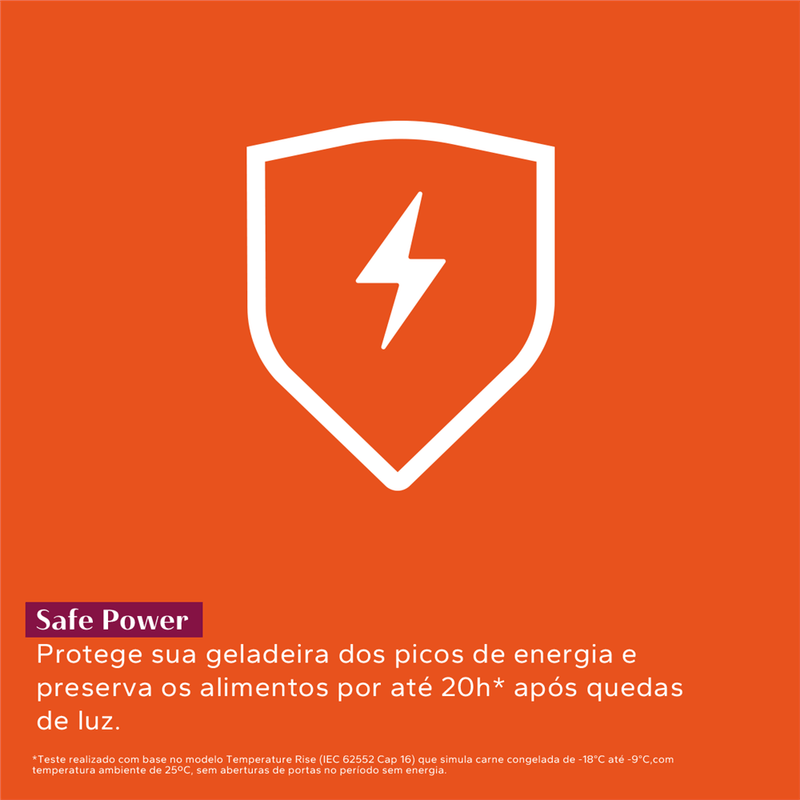 Não se preocupe com oscilações de energia! Essa tecnologia protege sua geladeira dos picos de energia e preserva seus alimentos por até 20h* após a queda de luz. *Teste realizado com base no modelo Temperature Rise (IEC 62552 Cap 16) que simula carne congelada de -18°C até -9°C,com temperatura ambiente de 25ºC, sem aberturas de portas no período sem energia.