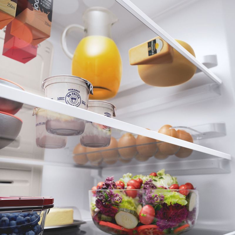 Lugar de alimento é na prateleira que você quiser! Tecnologia que distribui o ar frio igualmente na geladeira, deixando todos os compartimentos com a mesma temperatura, para você organizar tudo do seu próprio jeito.