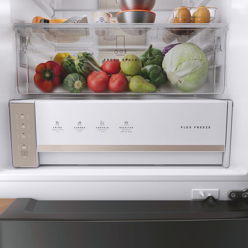 Conserve frutas e legumes frescos por até 20 dias[2] na gaveta Fresh Space ao toque do botão Smart Sensor, que ajusta a temperatura preservando nutrientes e vitaminas. É o frescor da caixa da feira para a sua geladeira.
