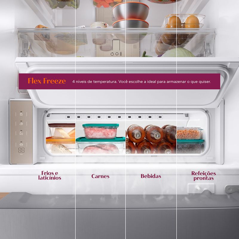 Compartimento independente e versátil, com 4 níveis de temperatura. Você escolhe a ideal para armazenar o que quiser: cerveja sempre trincando, refeições prontas, carne preservada por até 10 dias[3] sem congelar ou frios e laticínios no ponto certo. Se a sua rotina não é sempre igual, a temperatura da geladeira não precisa ser.