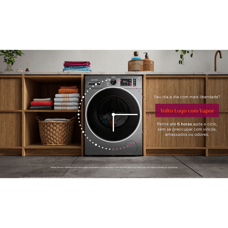 Tenha o poder do vapor a seu favor com 3 ciclos que facilitam sua rotina de lavagem. O ciclo Vaporizar desamassa e reduz odores sem precisar lavar; já o Lavar com Vapor entrega um resultado superior; e a função Volto Logo com Vapor permite deixar a roupa na máquina por mais tempo após o fim do ciclo sem risco de mau odor.