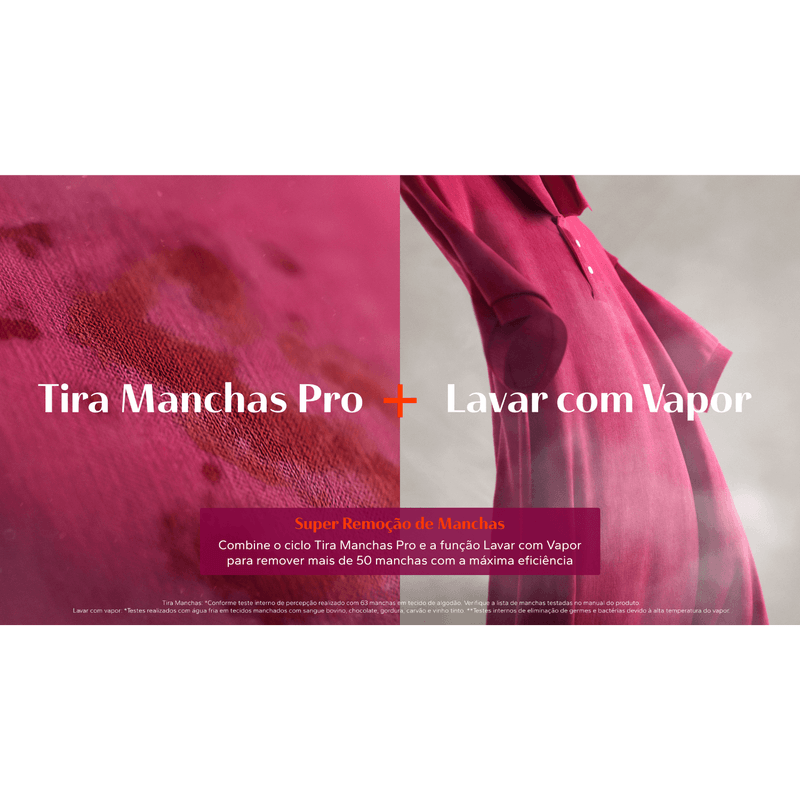 Quer uma lavagem poderosa? Combine o ciclo Tira Manchas Pro com a função Lavar com Vapor. Assim, é possível remover mais de 50 tipos de manchas6 e ainda contar com o vapor na remoção das sujeiras mais difíceis.
