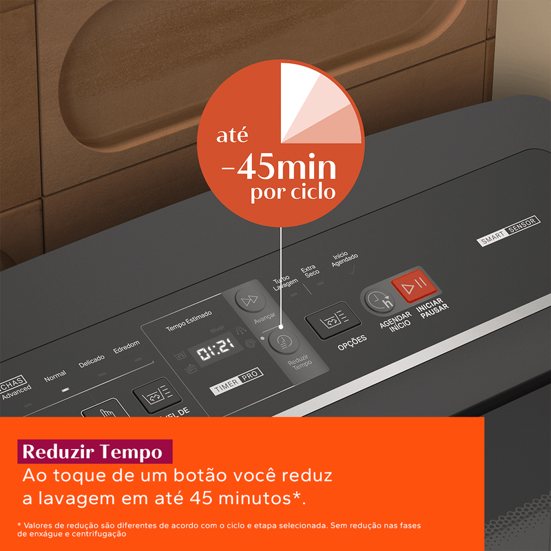 Já pensou em reduzir o tempo de uma tarefa com o toque de um botão? Com a função Reduzir Tempo você reduz as etapas de molho e agitação do ciclo em até 45 minutos[6], garantindo suas roupas limpas mais rápido.