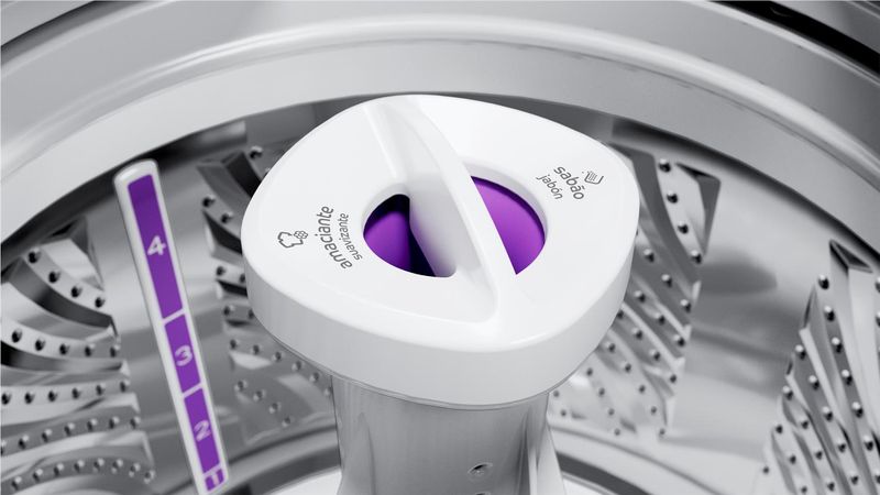 Sabão e amaciante entram em contato com as roupas no momento certo, evitando manchas.